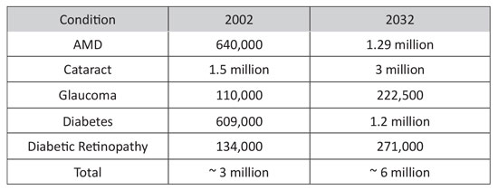 Analysis of the study data, including the number of patients that required active management of disease in 2002 and the projected need for care by 2032, indicates that over six million Australians will require medical eye care services. This doesn’t even include the surveillance of additional disease suspects and the treatment of uncorrected refractive error.
