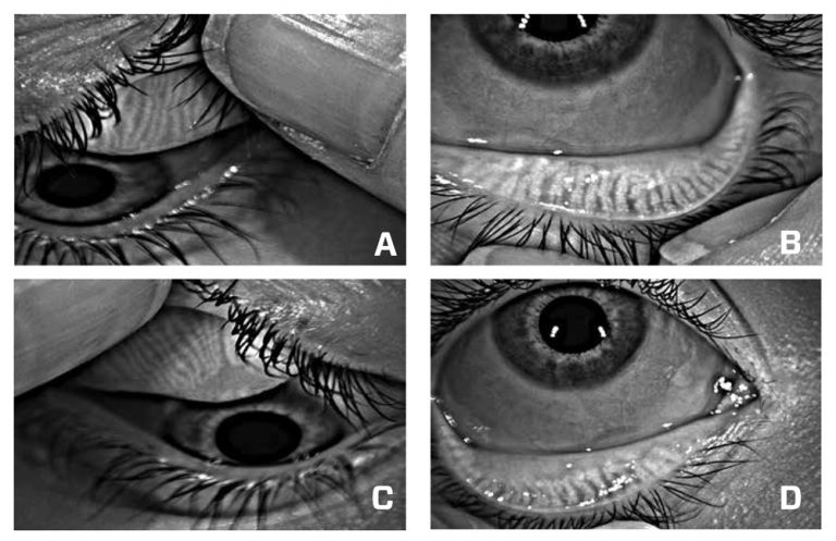 On initial examination, her visual acuity was R -0.25/-0.50×130 (6/6), L -4.25/-1.75×120 (6/6). There was no anterior blepharitis, lid margin telangiectasia or corneal staining but mild bilateral conjunctival staining, often indicative of dry eye. Meibography using infra-red imaging showed very early meibomian gland (MG) drop out (Figures 2A-D).