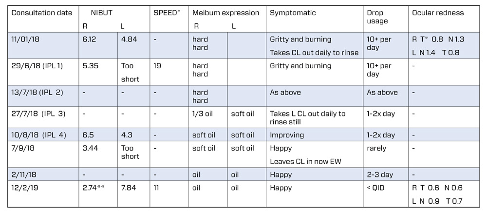 I reviewed her several times over five months with very little progress to improve the quality of her meibum. Her MGs remained difficult to express; she was still symptomatic and using eyedrops frequently. We discussed the use of oral doxycycline but she had irritable bowel syndrome, and with lack of obvious ocular surface inflammation, she was reluctant to proceed down this pathway. At this stage our clinic had the use of the EyeLight IPL and red photo-modulation mask and I suggested to her that we trial this. She returned the following week for her first IPL and photomodulation session (Table 1).