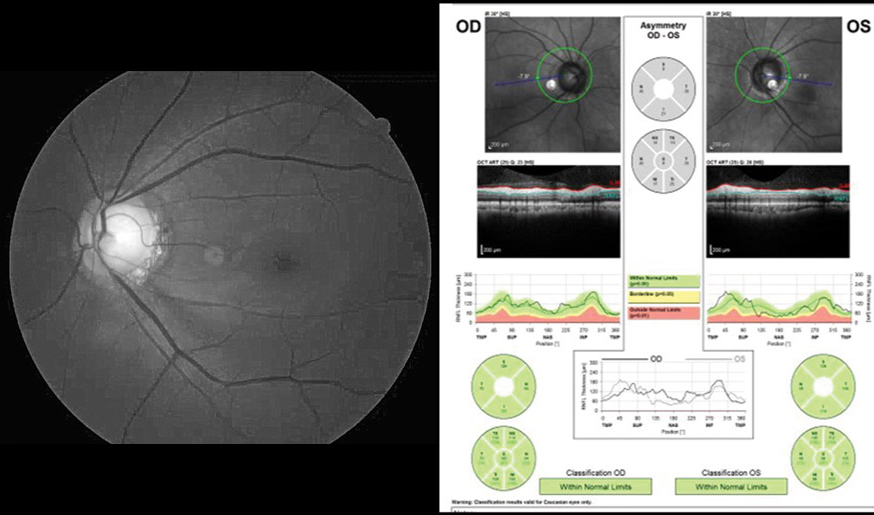 Similar to red disease discussed above, there may be instances where patient data may fall within the OCT normative confidence interval with results printed in green, yet have clinically, ophthalmoscopically visible damage to the RNFL and functional loss on threshold perimetry.⁶ This commonly occurs when inspecting the quadrant and clock hour graphs on OCT. When the RNFL analysis is divided into four quadrants or 12 clock hours, it must be remembered that considerable area is being averaged to give these sector values. A focal RNFL defect may be present ophthalmoscopically, but when averaged in with adjacent healthy tissue on OCT, the value may fall within the device’s normative database. Thus, everything is printed in green, giving a false sense of security in an eye that truly has structural damage. Thus, it is important to weigh the OCT results against the optic disc photographs and clinical examination to ensure that “green disease” is not missed⁷ (Figure 4).