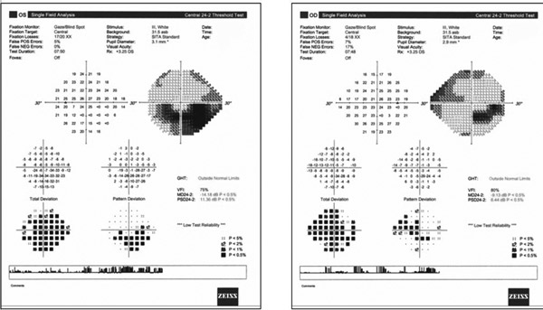 Intraocular pressure measurements and visual field results can be variable, especially when one considers patient compliance with medications and the psychophysical responses in threshold perimetry. Patients often overstate adherence to medical therapy. Even when not trying to be intentionally misleading, many patients may not correctly remember if they used their medication properly immediately before the examination. Medicines don’t fail overnight. A medically adherent patient will not have an IOP of 15 mmHg on one visit and 30 mmHg on the next visit due to medicine failure or progressing trabecular dysfunction.